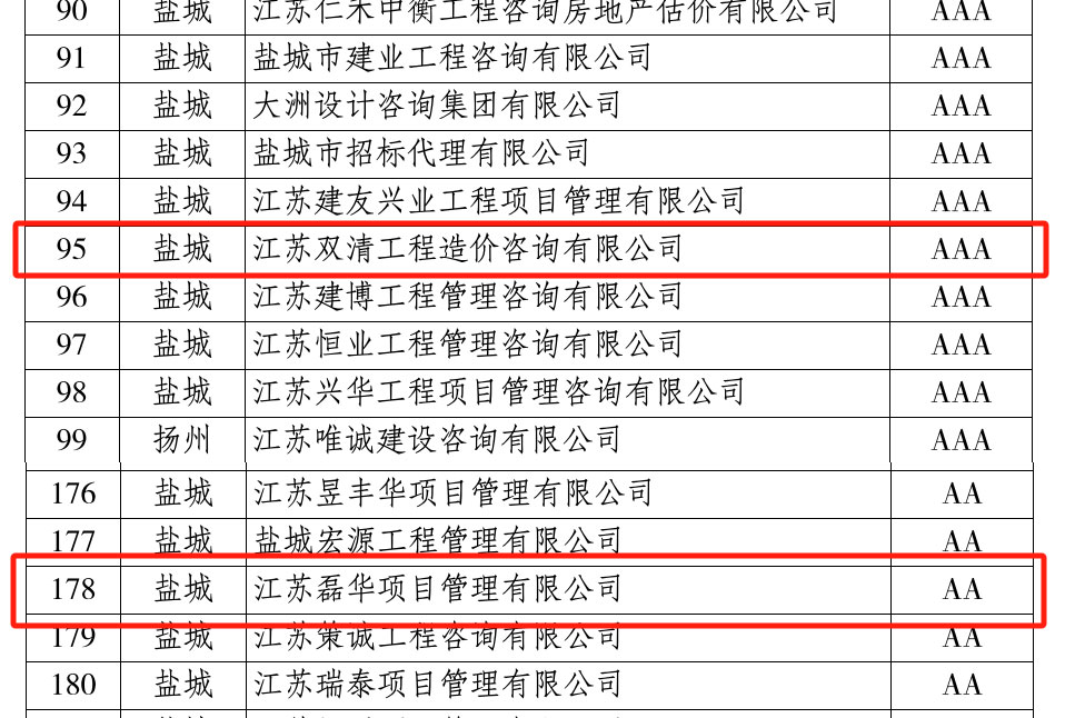 江蘇磊華項(xiàng)目管理有限公司獲得省AA級(jí)招標(biāo)代理信用評價(jià)、江蘇雙清工程造價(jià)咨詢有限公司獲得省AAA級(jí)招標(biāo)代理信用評價(jià)